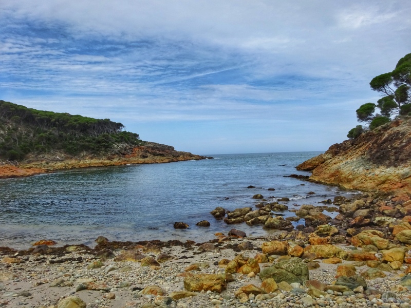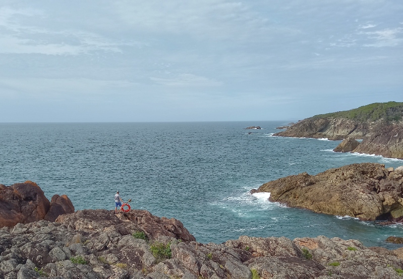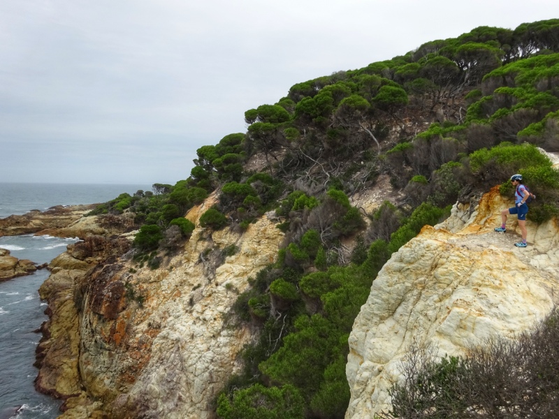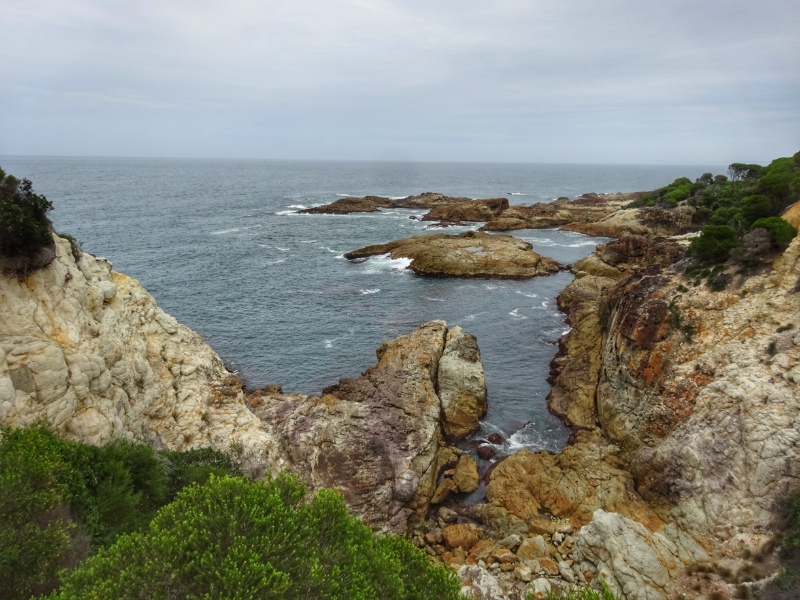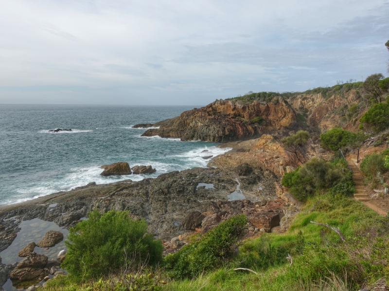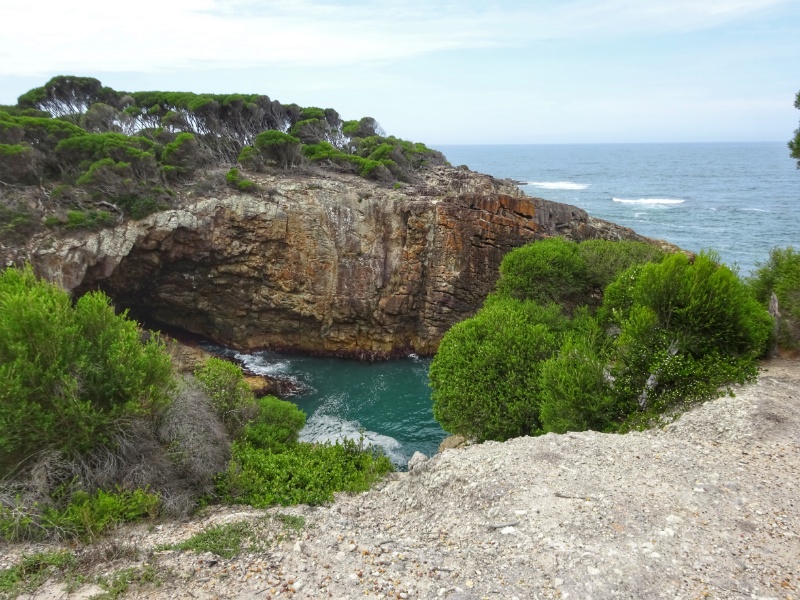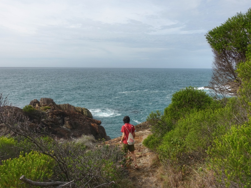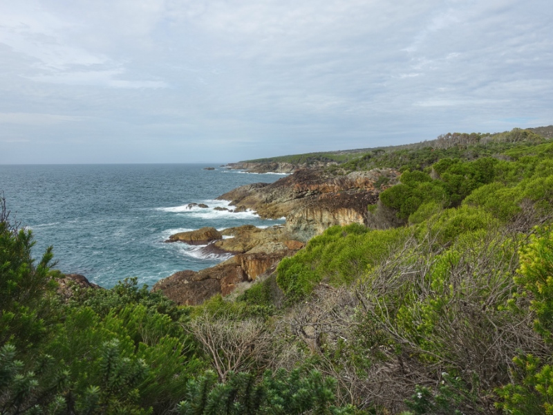 Am Vormittag machten wir uns auf den Weg, um ein kleines Stück des unmittelbar unter dem Hotel entlang führenden Küstenwanderweges „Wharf – to – Wharf“ zu gehen. Dieser erstreckt sich über 27km an der Küstenlinie von der Merimbula- zur Tathra Wharf. Da es sich hier wie gesagt um ein recht wildes Stück Küstenlandschaft handelt, war durchaus die eine oder andere Kletterpassage dabei.