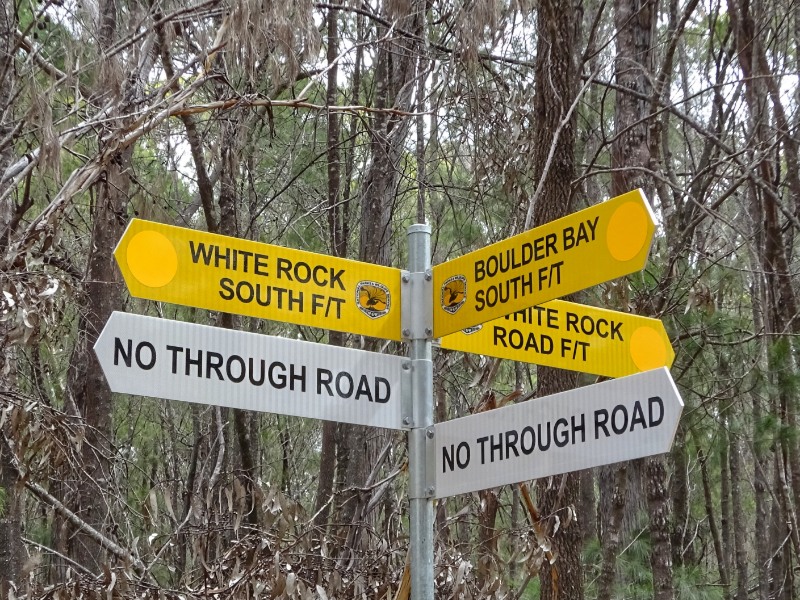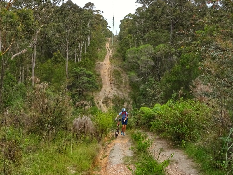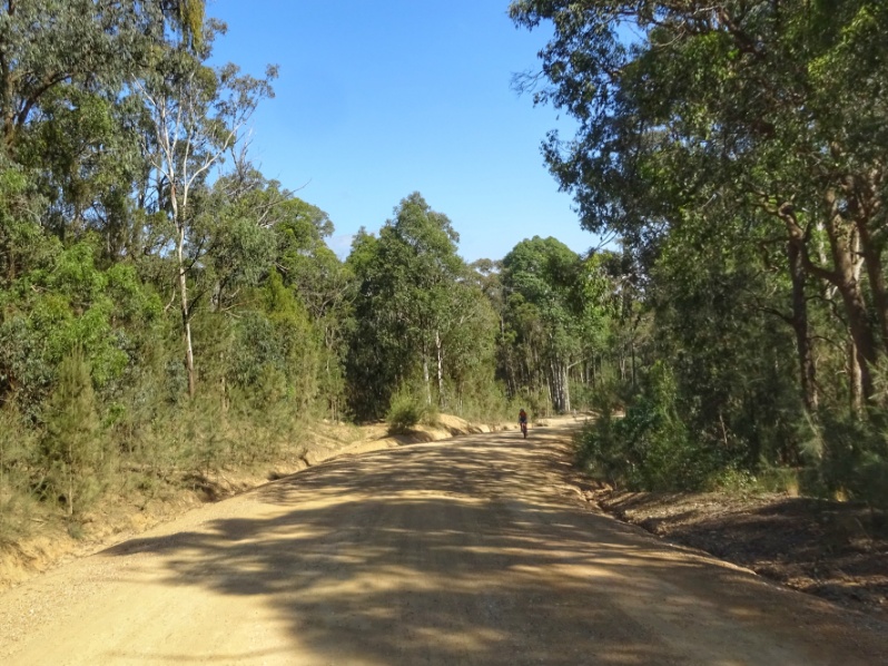 Lange hielten wir uns damit nicht auf, denn für heute stand eine etwas längere Tour ins Hinterland auf den Doctor George Mountain, mitten im Mimosa Rocks Nationalpark, auf dem Programm. Zum Glück hatten wir bei der Anfahrt noch schnell im Wild Orchid Café angehalten und uns mit einem köstlichen Flat White gestärkt, denn die in den 10 km langen Anstieg „eingebauten“ Rampen erreichten immer wieder für längere Zeit 20% Steigung und mehr. Lägen nun nicht schon fast 3 Wochen harten Bergtrainings hinter uns, hätten wir das vielleicht gar nicht geschafft. So kamen, wir wenn auch schwitzend, stöhnend und fluchend, irgendwann oben an, aber der erwartete Blick war fast zugewachsen. Durch die Zweige konnte man aber schon noch die grüne Ebene und die Stadt Bega unter uns erahnen.