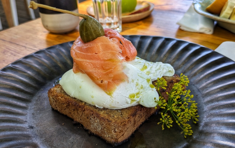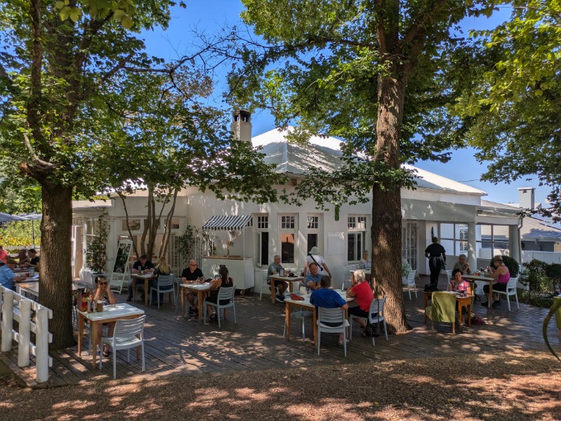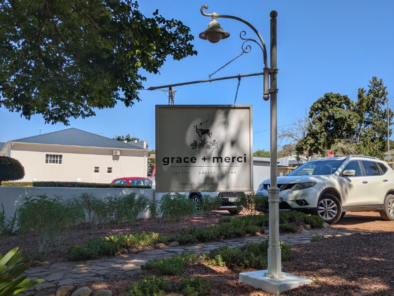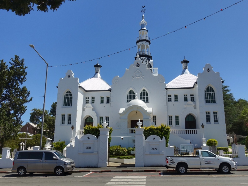 Die lange Fahrt zum Startpunkt unseres Events an der St. Francis Bay bei Port Elizabeth bzw. Gqeberha hatten wir in 2 Etappen aufgeteilt. Teil 1 führte uns nach Wilderness am Indischen Ozean. Auch das waren schon knapp 5 Stunden Fahrzeit. Grund genug, ein Zwischenstopp in Swellendam einzulegen, einem kleinen, schönen Ort mit vielen Häusern im kapholländischen Stil. Ein besonderes Wahrzeichen ist die Moederkerk im Stadtzentrum. Wer an die Gardenroute reist, sollte hier unbedingt anhalten, denn neben den historischen Gebäuden gibt es eine Reihe netter Cafés, Restaurants und Galerien. Wir hielten wie so oft nur zum Essen, besser gesagt zu einem späten Frühstück. Dabei landeten wir in dem selben Café, in dem wir schon vor einigen Jahren eingekehrt waren und unsere erste Melktart gegessen haben. Zwar gab es diese südafrikanische Süssspeise diesmal nicht, aber wir haben trotzdem sehr gut gegessen.