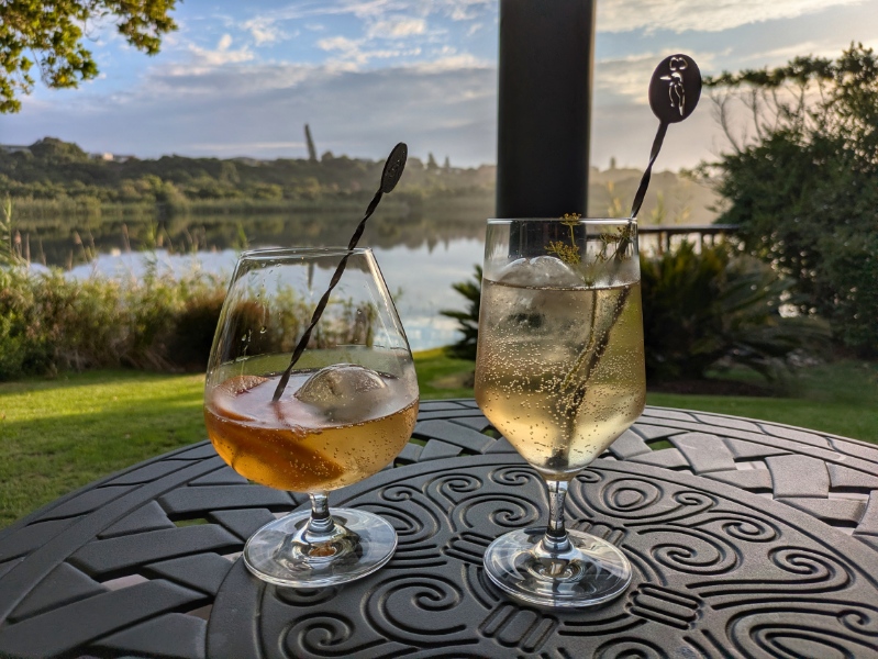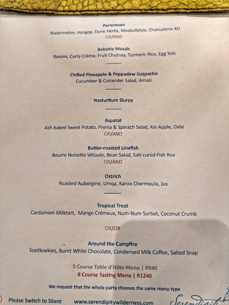 Vor dem Essen sitzt man bei einem Drink am Fluss zusammen und der Chef erläutert jeden einzelnen Gang mit sehr viel schauspielerischem Talent. Dabei spricht er über Pflanzen und Tiere, von denen wir vorher nicht einmal wussten, dass es sie gibt, geschweige denn, dass man sie essen kann. Dabei kam sehr oft das in Südafrika häufig genutzte Wort „Lekker“ vor. Und so war das dann auch. Unmöglich, sich alles zu merken, geschweige denn zu übersetzen. Aber die Bilder sprechen auch so für sich.