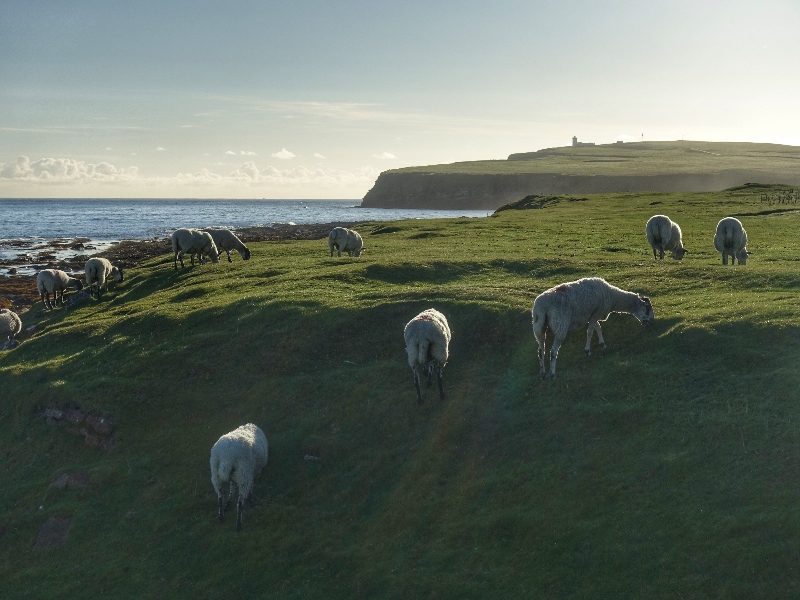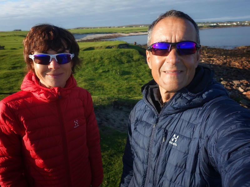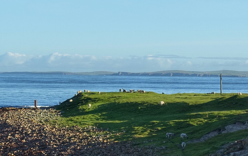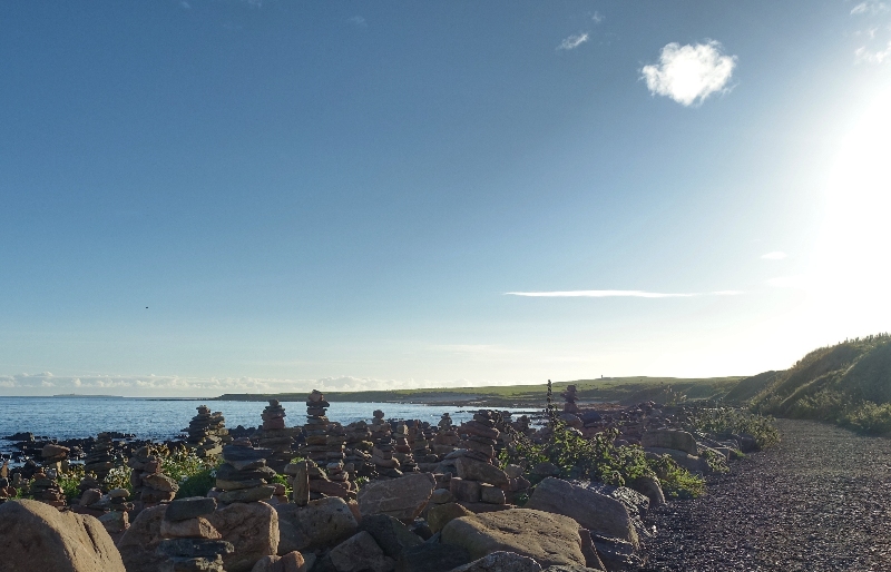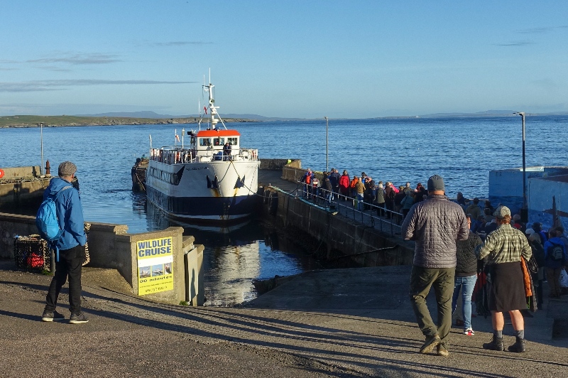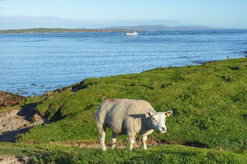 Bis zur Abfahrt unseres Shuttles blieb noch etwas Zeit, die wir zu einer Miniwanderung an der Küste nutzten. War bei dem Top-Wetter ein Genuss, aber wahrscheinlich hat man nur ca. 10 Tage im Jahr dieses Glück. Ein Touristenboot machte sich auch gerade mit Tagesausflüglern zu den Orkney Inseln auf den Weg.