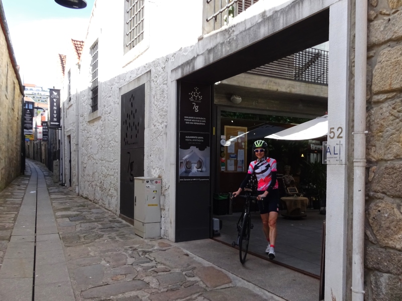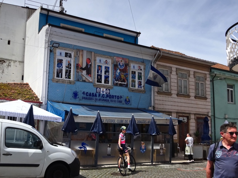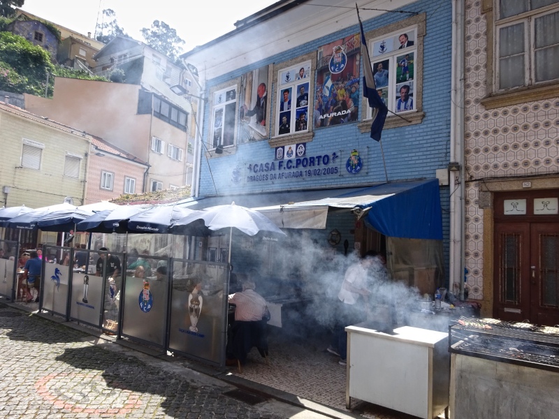 Für uns war es auch ein Paradies – zumindest so lange der Wind von hinten blies. Aber irgendwann mussten wir dann doch umkehren und uns gegen den inzwischen zum Sturm gewordenen Luftwiderstand zurück kämpfen. Aber wir hatten ja ein Ziel vor den Augen: das Mittagessen in einem der Fischrestaurants im eher dörflichen Teil Gaias. Uta hatte wie immer fleißig recherchiert und natürlich konnte ich mich auch diesmal auf meine Reiseleiterin verlassen. Nachdem wir zunächst die wunderschönen Gassen durchradelt hatten und bereits an dem einen oder anderen schon in Betrieb genommenen Grill vorbei gekommen waren, stoppte mein Guide vor der Kneipe eines Fanklubs des FC Porto.