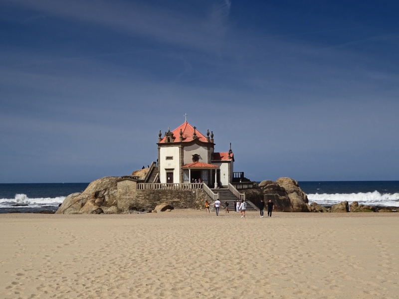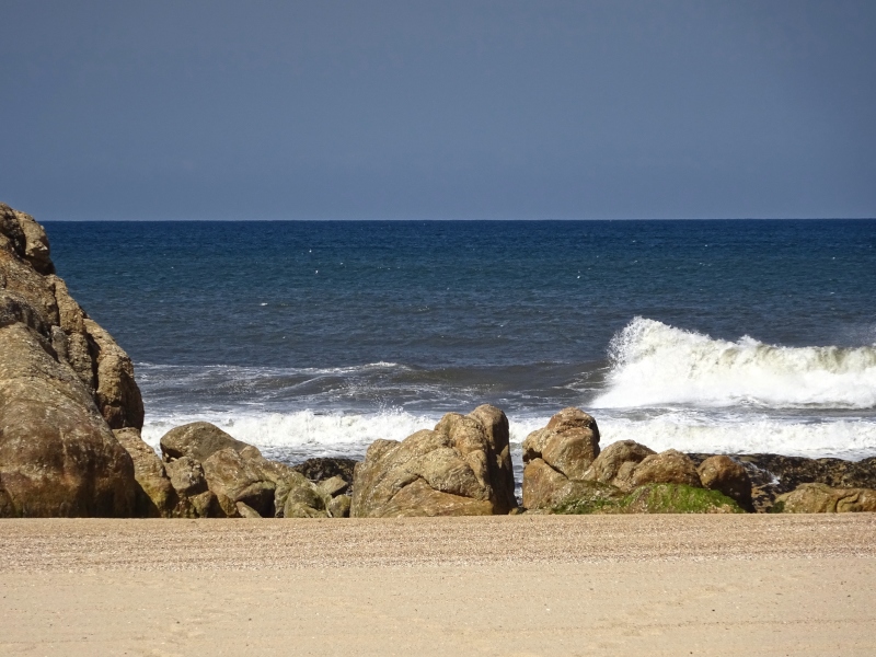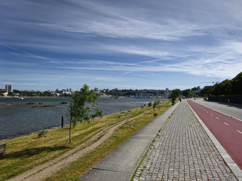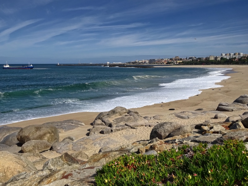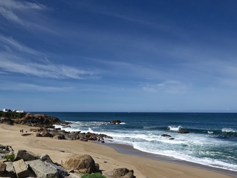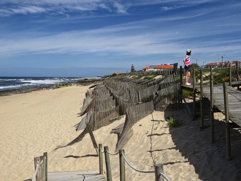Nach einem kurzen Abschnitt durch die Fußgängerzone am Flussufer begann bald ein breiter und bestens ausgebauter Radweg, den wir fast die ganze Tour nutzen konnten. Die Fahrt entlang der Küste war bei dem herrlichen Wetter trotz des strammen Windes ein echtes Vergnügen. Neben dem Radweg hat man durch die Dünen für Fußgänger einen Weg aus Holzplanken gebaut. Auch der begann bereits kurz nach Gaia und das Ende war nicht in Sicht, als wir nach ca. 20 km umkehrten. Der Weg wurde am Vormittag auch von zahlreichen Wanderern genutzt. Endlose helle Sandstrände, hohe Wellen, starker Wind und Sonnenschein. Nicht umsonst ist die Atlantikküste vor Portugal das Paradies für Surfer und Wellenreiter.