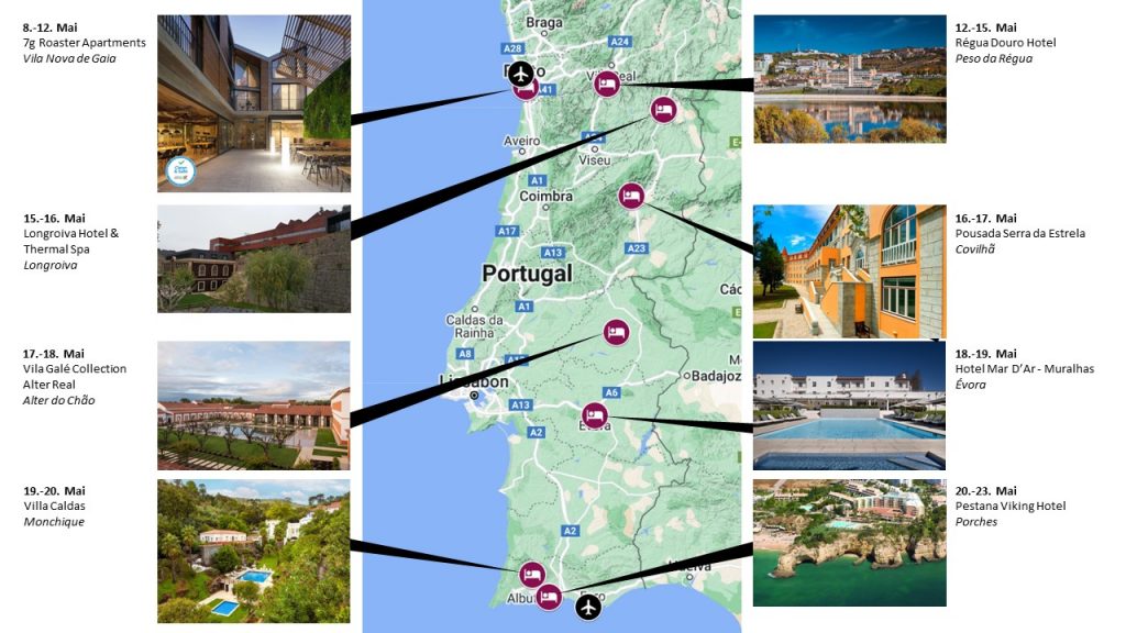 So wie ihr es gewohnt seit, gibt es erstmal eine Übersichtskarte. Wir durchreisen das Land vom Norden nach Süden. Beginnen werden wir in der Portweingegend in Vila Nova de Gaia nahe Porto. Dort soll es den einen oder anderen Portweinkeller geben. Noch kennen wir uns mit diesem Getränk nicht so richtig aus, aber das soll sich in den kommenden Tagen ändern. Dann geht es über 7 Stationen bis ganz in den Süden an die Algarve. Die Hotels sind alles erlesene 4 und 5 Sterne Wellness bzw. Spa-Hotels.