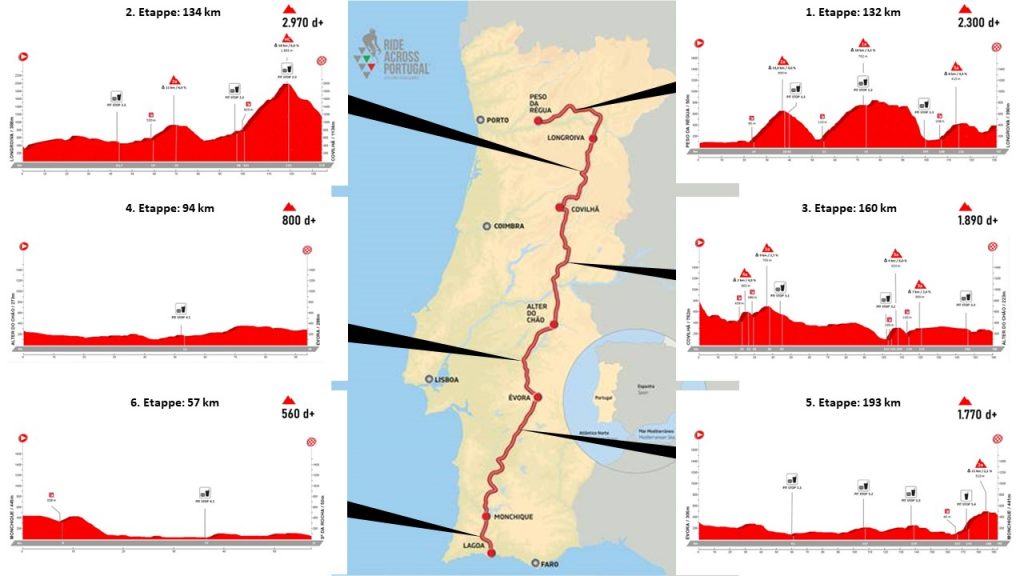 Auf der Suche nach neuen Herausforderungen bin ich über die Tour „Ride Across Portugal“ gestolpert. Hört sich fast so an wie eines unserer großen Abenteuer im letzten Jahr, das „Ride Across Britain“. Es ist sozusagen die Luxusvariante dieser extremen Herausforderung, denn diesmal übernachten wir nicht in Zelten, sondern tatsächlich in 4 und 5 Sterne Wellness Hotels. Es sind auch nicht 800 Teilnehmer am Start, sondern wahrscheinlich nur 50 bis 60. Statt 9 sind es diesmal „nur“ 6 Etappen, wobei auch „nur“ 800km zu bewältigen sind. Aber dazu komme ich dann später noch in diesem Blog, wenn der 15. Mai und damit der Start naht. Hier die Übersicht der Streckenführung.