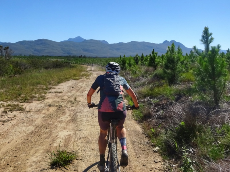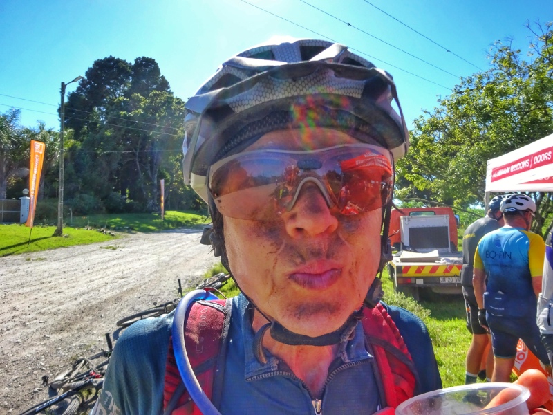 Die gute Grundlage war wichtig, denn es ging heute gleich nach dem Start mit vollem Tempo erst auf Asphalt und dann auf einer Schotterstraße zur Sache. In einer großen Gruppe mit über 30 km/h über staubtrockenen Schotter zu heizen, ist schon ein besonderes Erlebnis, weil man durch den aufgewirbelten Staub nur noch maximal das Hinterrad des Vordermanns sieht. Das bringt mich gleich noch zur Klärung der Hintergründe des gestrigen Bein-Fotos. Was man dort gesehen hat war eine dicke Schicht aus Staub, die sich auf der von Sonnencreme und Schweiß klebrigen Haut abgesetzt hatte – also kein Schlamm oder gar Sturz. So sahen wir die Tage eigentlich immer am ganzen Körper aus. Heute darf ich neben den Bildern von der Strecke ein weiteres Beweisfoto veröffentlichen.