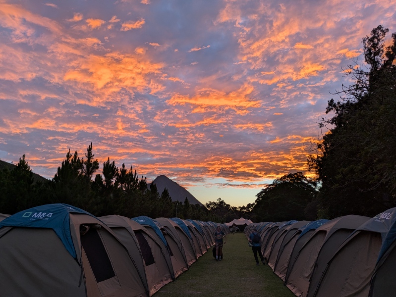 Na ja, ganz so entspannt wie es die reißerische Überschrift verspricht war der Tag dann doch nicht. Aber beginnen wir wie immer mit dem Morgenkino am Himmel, das ich diesmal eine Stunde früher beobachten durfte, da der Start der letzten Etappe bereits um 7 Uhr erfolgte. Da war das Frühstück um 5:30 Uhr, das vorallem der Kohlenhydratzufuhrt diente, schon eine echte Herausforderung.