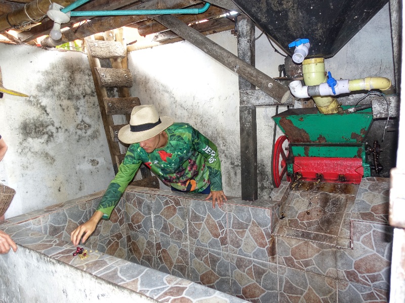 Die kleine Farm ist so angelegt, dass neben den Kaffeepflanzen, auch sehr viel Obst- und Kräuterpflanzen wachsen. Ausser den üblichen Verdächtigen wie Papayas, Bananen, Avocados gibt es noch jede Menge anderes Obst, dessen Namen wir trotz des Besuches auf der Fruchtfarm vor ein paar Tagen nicht einmal kannten. Jetzt kommen wir zu den Bienen und den Blüten. Die Bienen und andere Insekten bestäuben natürlich nicht nur die Kaffeepflanzen sondern auch alle anderen Blüten und so gelangen die Pollen der Obstblüten auch in die Blüten der Kaffeepflanzen und sorgen so für den einmaligen Geschmack des Kaffees jeder kleinen Farm hier. Der gesamte Anbauprozess ist wirklich komplett ökologisch und echt „Bio“. Alles wird verwertet und es werden keinerlei Chemikalien oder ähnliches eingesetzt. Die Ernte ist aufgrund der Hanglage äußerst mühsam und reine Handarbeit. Dies ist der große Unterschied zur Massenproduktion des brasilianischen Kaffees, wo alles maschinell erfolgt, was zu der deutlich schlechteren Qualität führt.