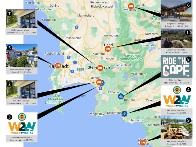 Wir haben uns eine Reise „zusammengebastelt“, die hoffentlich voller spannender Erlebnisse und neuer Eindrücke sein wird. Nicht völlig überraschend hat es auch die eine oder andere sportliche Herausforderung in das Programm geschafft. Ob die ebenfalls bereits geplanten Aufenthalte in einigen der interessantesten Wine Estates und Restaurants der Provinz für das nötige „Carboloading“ und die wichtige „Hydration“ sorgen werden, wird – vorsichtig ausgedrückt – ein interessantes Experiment.