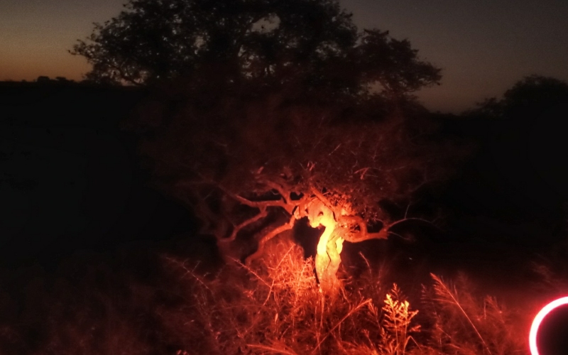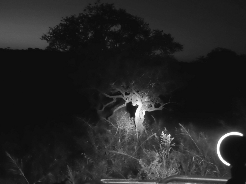 Aber zurück zu gestern Abend. Inzwischen war es schon richtig dunkel geworden und wir waren auf dem Rückweg, als ein anderer Wagen unmittelbar vor uns ein paar Löwen im Gras entdeckte. Zunächst sah es so aus, als sei die Gruppe auf der Jagd nach einer Büffelherde, die auch noch in der Nähe war. In der Dunkelheit soll man die Raubkatzen nicht mit Scheinwerfern anstrahlen, da sie dadurch ihre besondere Nachtsichtfähigkeit für längere Zeit verlieren. Daher werden Scheinwerfer mit rotem Licht benutzt, wodurch dieser Effekt vermieden wird. Was wir dann in dem roten Licht sahen, war etwas ganz besonderes, ja sogar einmaliges. Einer der jungen Löwen kletterte tatsächlich aus lauter Übermut auf einen Baum. Leider war das in dem roten Licht und ansonsten bei absoluter Dunkelheit kaum zu fotografieren. Ich stelle das Foto trotzdem ein, einmal im Original und einmal schwarz / weiß. Vielleicht könnt ihr erahnen, wie der Kerl da oben auf dem Baum hängt. Unglaublich!