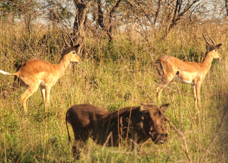 Eigentlich war das eine recht erfolglose Safari gestern Abend. Wir waren stundenlang auf der Suche nach den Elefanten kreuz und quer durch das Reservat gefahren. Nichts zu sehen von den eigentlich unübersehbaren Dickhäutern und auch sonst lief uns nichts spektakuläres vor die Linse. So ist das manchmal, wenn man unbedingt bestimmte Tiere finden will, insbesondere bei dieser Landschaft und Pflanzenwelt hier. Das Gras ist sehr hoch und bietet vor allem den Raubkatzen besten Sichtschutz. Aber auch die sehr vielen großen Büsche und kleinen Bäume in dem hügeligen Terrain sind bestens geeignet, die Elefanten und Nashörner verschwinden zu lassen. Einzig die Giraffen sind wie immer weit sichtbar.