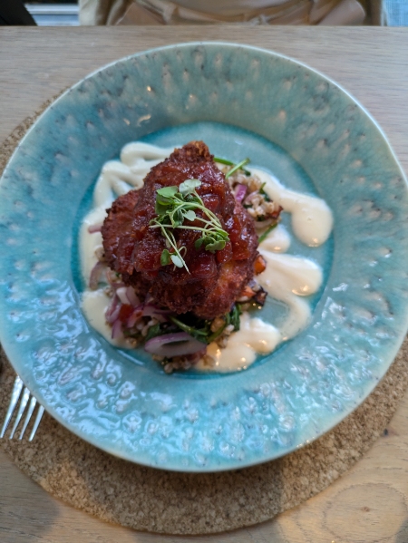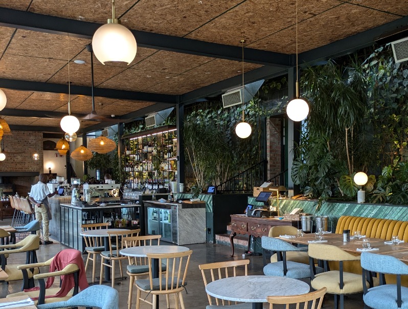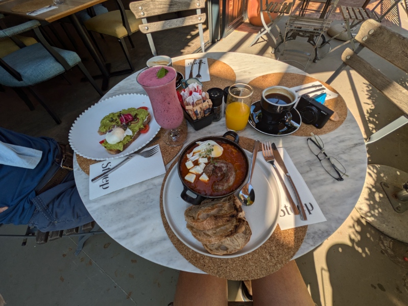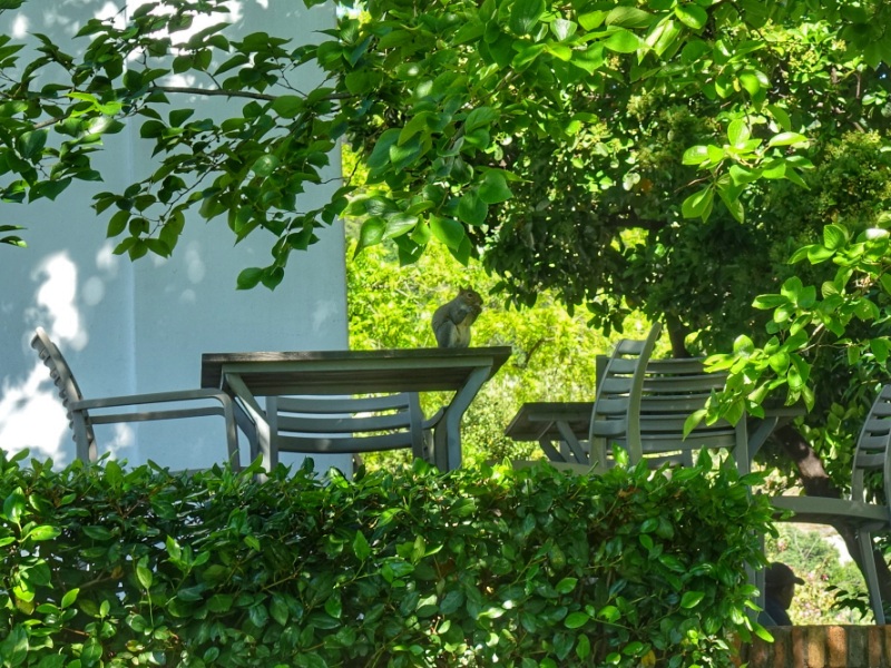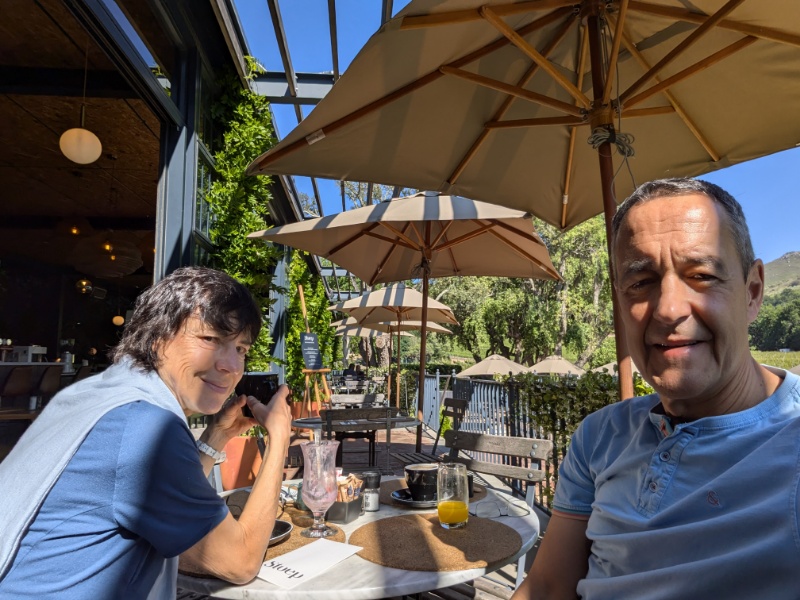 Gut ausgeschlafen und ordentlich hungrig war der erste Tagesordnungspunkt ein gescheites Frühstück. Was uns da erwartete, bestätigte sowohl unsere Hoffnungen als auch Erfahrungen, was man da in Südafrika erwarten darf. Wir haben hier die Auswahl zwischen 2 Restaurants. Heute fiel unsere Wahl auf das „Stoep“, Afrikaans für Veranda. Die richtige Wahl, wie sich schnell herausstellte. Zwar war zumindest mein Gericht – Chakalaka mit Boerowrs und pochiertem Ei (eine Art orientalisches Letscho mit südafrikanischer Bratwurst) – weder leicht verdaulich noch das typische Frühstück für Ausdauersportler, aber ich hatte ja angekündigt, in dieser Hinsicht neue Weg zu beschreiten.