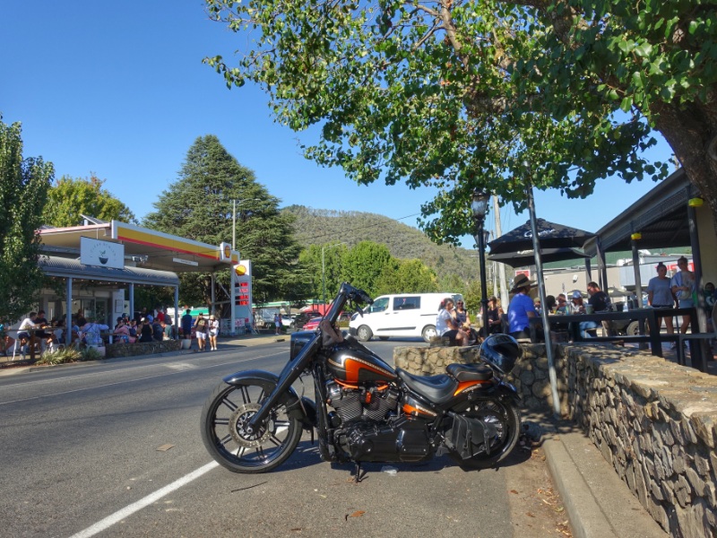 Zunächst mussten wir allerdings aus den Bergen an den Ozean kommen. Viele Straßen gibt es hier ja nicht und insofern war klar, dass wir die berühmte Great Ocean Road bis zum Ende nach Bairnsdale, unserem gestrigen Tagesziel befahren würden. Unser Plan sah vor, uns nach wenigen Kilometern einen ersten Kaffee in einem wie immer von Uta sorgfältig recherchierten Café in dem kleinen Ort Bright zu genehmigen. Da hatten wir aber die Rechnung ohne ein paar hundert Harley Davidson Fahrer und noch mehr Outdoor verrückten Australiern gemacht, die offenbar alle in das selbe Café wollten. Und so wurde aus dem kurzen Stopp die längste Kaffee Wartezeit ever.