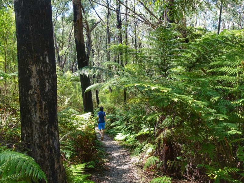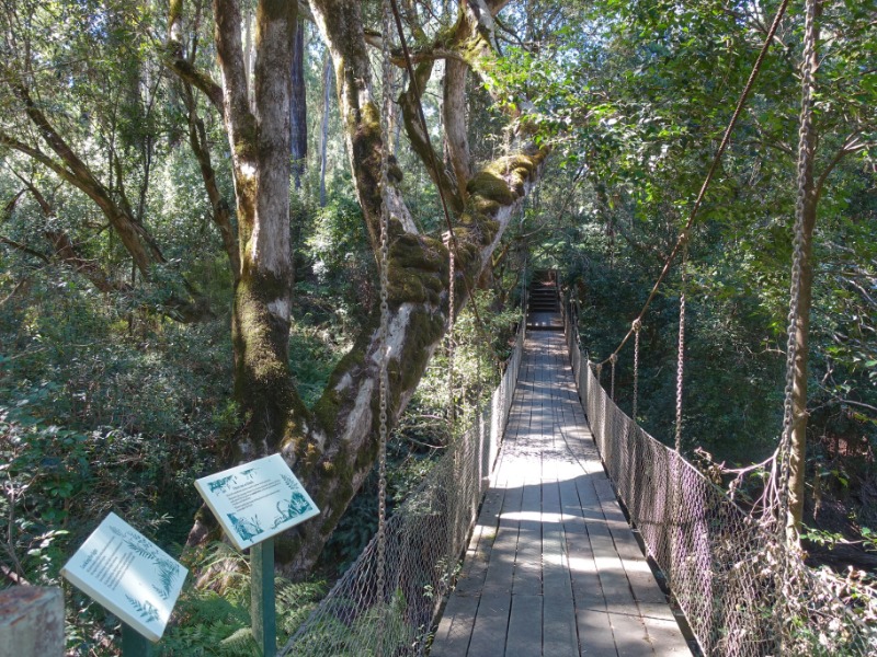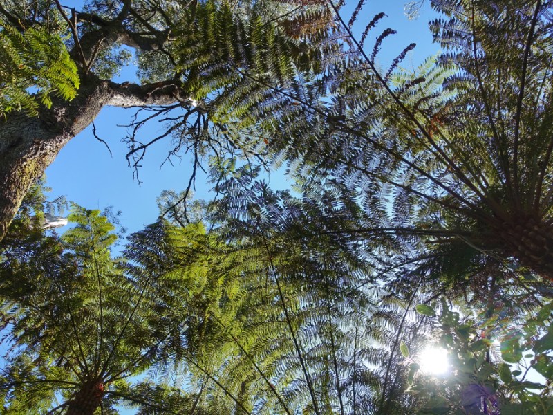 Unser nächster Stopp galt dem McKenzie River Rainforest Walk. Hört sich langweilig an, war aber sehr interessant. Bekanntlich gibt es ja immer wieder sehr ausgedehnte Buschfeuer in den australischen Eukalyptus-Wäldern. Dadurch wird das Unterholz niedergebrannt, die hohen Bäume bleiben aber oft ganz oder nur als blattlose Stämme erhalten. Aus dem fruchtbaren Ascheboden wachsen dann neue Bäume. Wo längere Zeit keine Buschfeuer wüten und auch der Mensch nicht eingreift, entstehen dichte Regenwälder, die dann mit der Zeit so dicht und feucht werden, dass die Feuer gar keine Chance haben. Diesen Kreislauf gibt es seit vielen 1000 Jahren. Durch die zunehmende Trockenheit werden allerdings die Feuer immer stärker und die Fläche der Regenwälder schrumpft. Es gibt sie fast nur noch an der Südostküste und auf Tasmanien. Einen solchen Regenwald haben wir heute besucht. Besonders beeindruckend sind die Baumfarne, die angabegemäß zu den größten der Welt gehören.