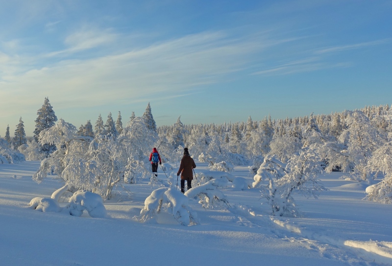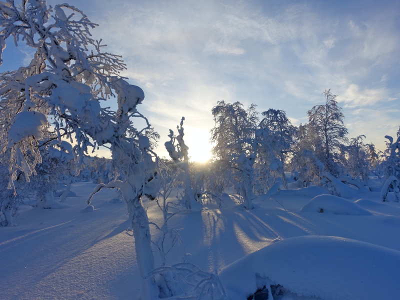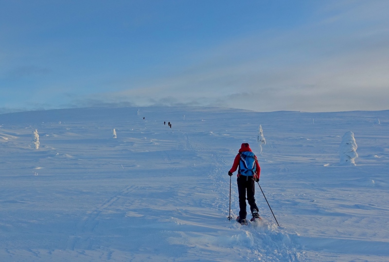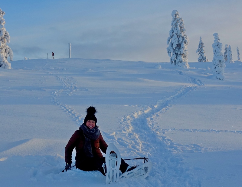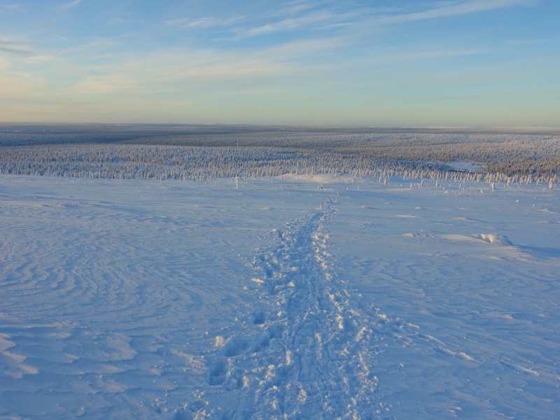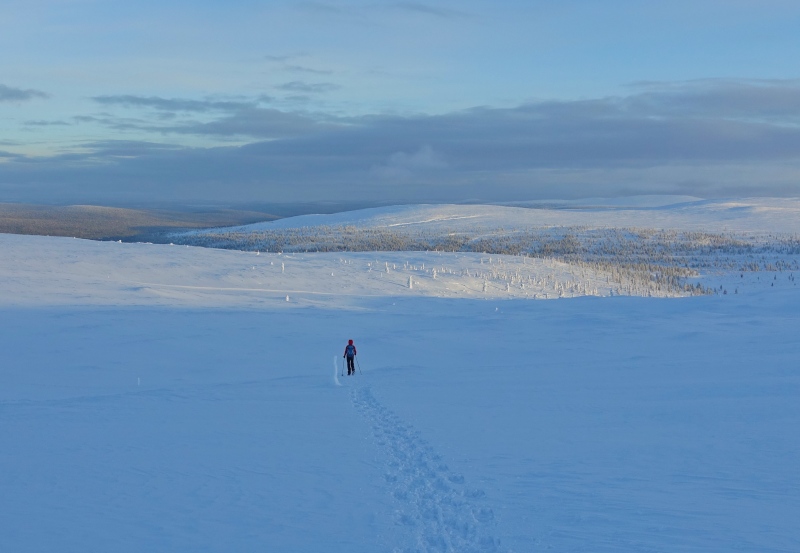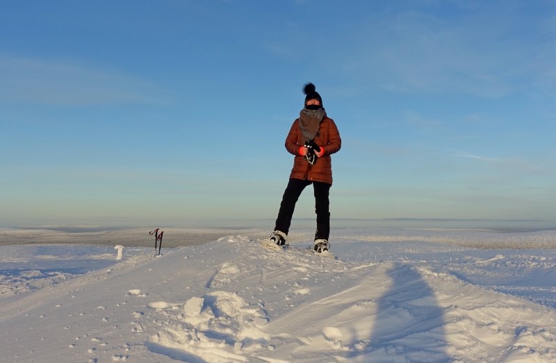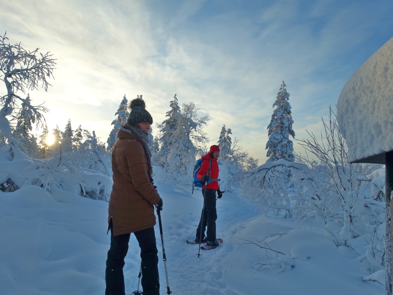 Wie ihr bereits gelernt habt, heißen die Berge hier Tunturi und sind nicht ganz so hoch, was aber nicht heißt, dass der Aufstieg nicht anstrengend ist. Die Baumgrenze liegt hier schon so bei 400 Meter und spätestens ab dort pfeift ein ordentlicher Wind, was einen die – 10 Grad nochmal deutlich kühler empfinden lassen. Wir haben uns davon nicht abschrecken lassen und sind auf den 570 Meter hohen Kiilopää Tunturi gestiegen. Wir haben unsere Schneeschuhe dabei und Ute konnte sich im nahe gelegenen Outdoorladen ein Paar ausleihen. Nach einem kleinen Strauchler am Anfang kam sie damit auch bestens zurecht, gut auf den Berg und natürlich auch wieder runter.