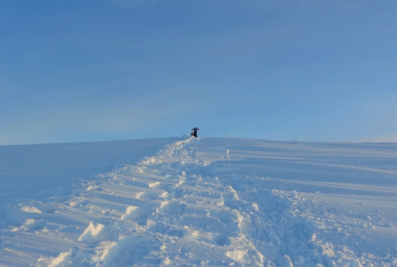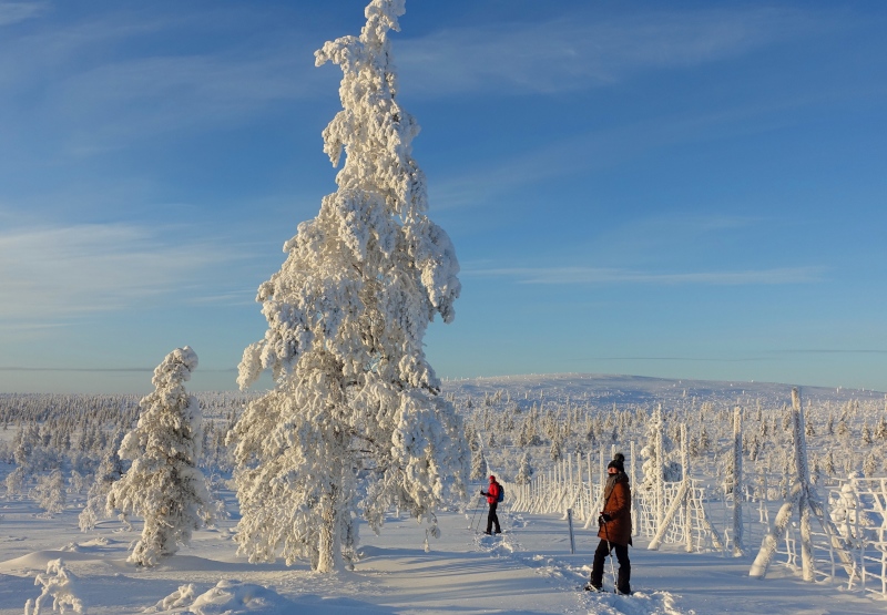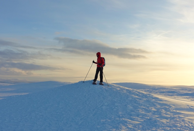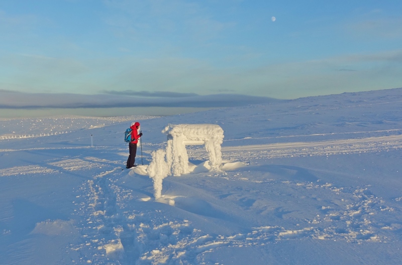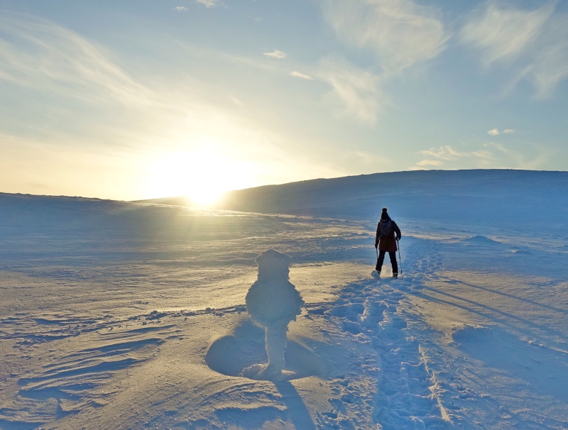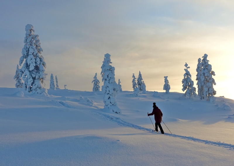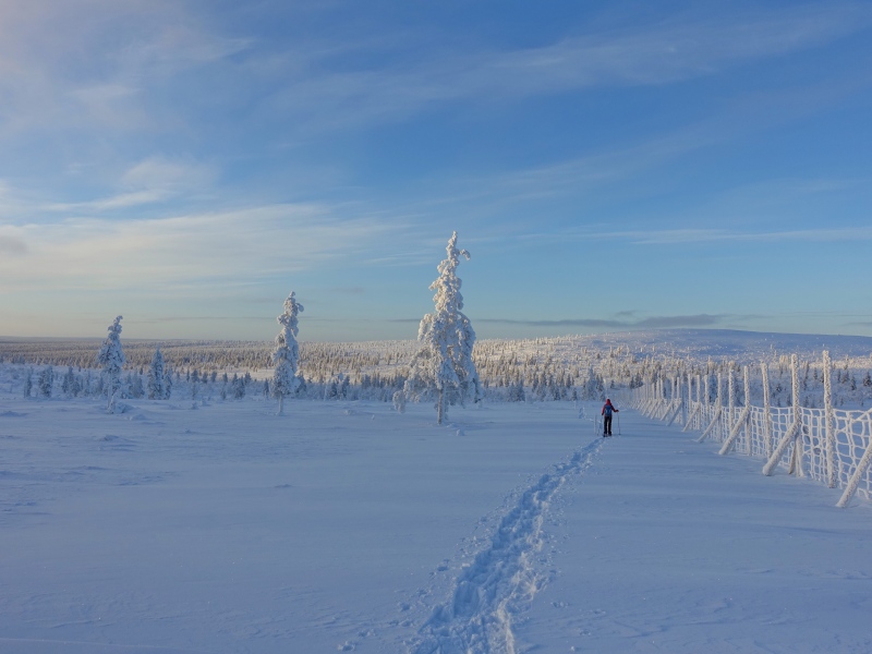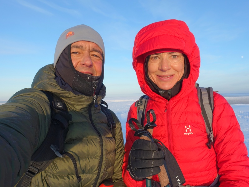 Wie ihr bereits gelernt habt, heißen die Berge hier Tunturi und sind nicht ganz so hoch, was aber nicht heißt, dass der Aufstieg nicht anstrengend ist. Die Baumgrenze liegt hier schon so bei 400 Meter und spätestens ab dort pfeift ein ordentlicher Wind, was einen die – 10 Grad nochmal deutlich kühler empfinden lassen. Wir haben uns davon nicht abschrecken lassen und sind auf den 570 Meter hohen Kiilopää Tunturi gestiegen. Wir haben unsere Schneeschuhe dabei und Ute konnte sich im nahe gelegenen Outdoorladen ein Paar ausleihen. Nach einem kleinen Strauchler am Anfang kam sie damit auch bestens zurecht, gut auf den Berg und natürlich auch wieder runter.