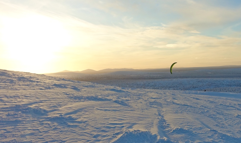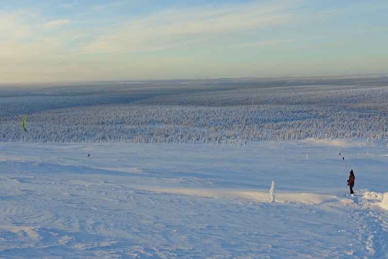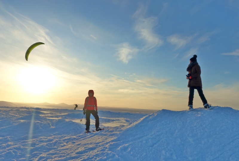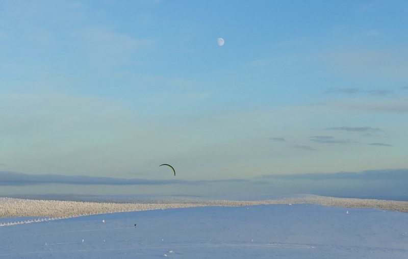 Etwa auf halben Weg bekamen wir noch eine Vorführung der besonderen Art. Ein Snowkiter packte sein Kite aus, schnallte die Ski unter und ab ging es. Sehr beeindruckend und macht bestimmt Riesenspaß – wenn man es kann. Der Kollege war jedenfalls die ganz Zeit, die wir auf dem Berg verbrachten, in der Luft bzw. auf dem Schnee unterwegs.